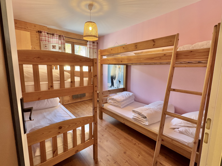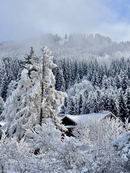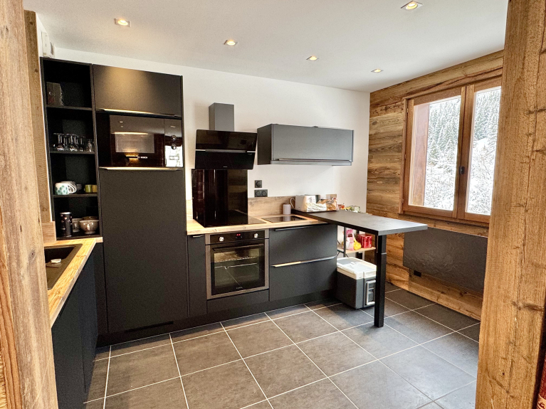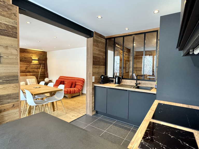 Este apartamento, totalmente renovado, dispone de un amplio salón con cocina americana totalmente equipada, dos sofás cama y un gran balcón sin vistas con mesa para 6 personas, que ofrece vistas ininterrumpidas del bosque nevado.