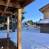Mesas exteriores, sillas y sombrilla en la terraza.
