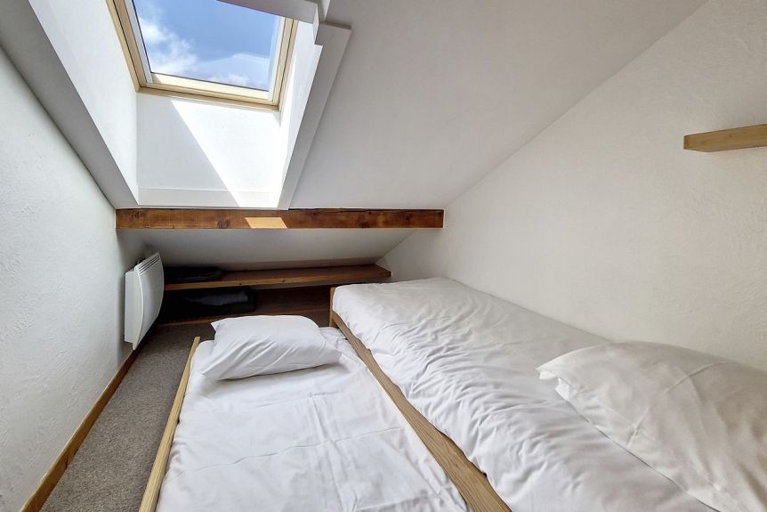 Dormitorio cerrado: una cama individual y una cama nido (suelo enmoquetado).