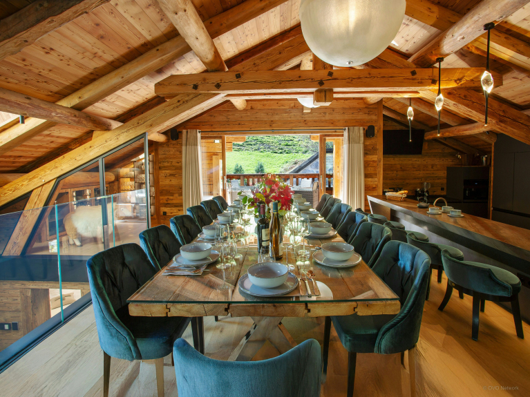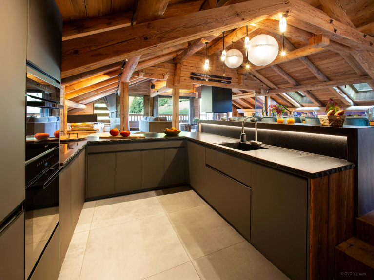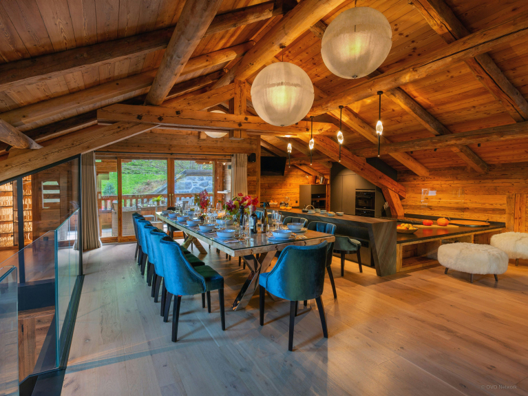 El amplio salón permite disfrutar plenamente del paisaje gracias a sus ventanales, que se abren a dos balcones con calefacción. Una chimenea central separa el comedor del salón, y la cocina, totalmente equipada, dispone de electrodomésticos de alta gama, como un gran frigorífico americano. Para tomar un aperitivo, aproveche el bar.