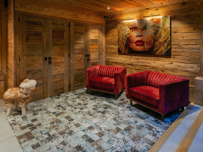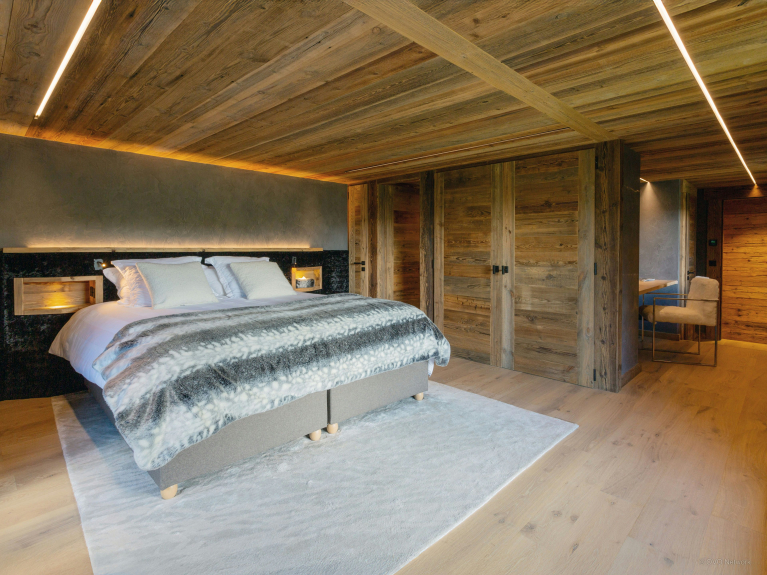 Cinco de los seis dormitorios se encuentran en la planta baja. Todas disponen de una gran cama de matrimonio, y tres de ellas cuentan además con cuarto de baño privado y acceso al balcón. Los otros dos dormitorios están comunicados por un cuarto de baño. En esta planta también encontrará una sala de TV y una sala de esquí con secador de botas térmico, lavadora y secadora.