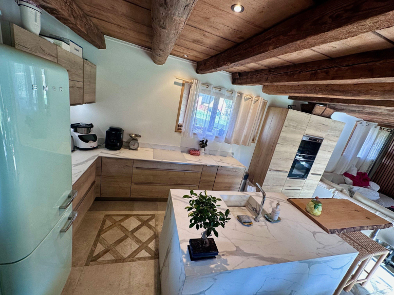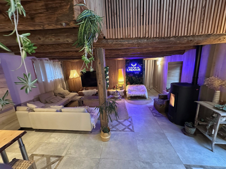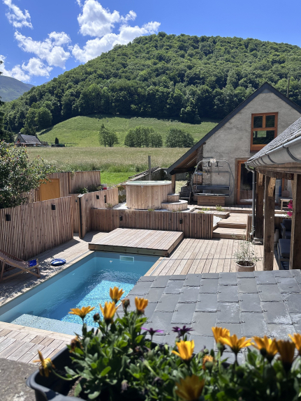 Terraza cubierta orientada al sur con mesa XXL, pista de petanca, baño finlandés con vistas a la montaña y piscina climatizada (de mayo a septiembre).