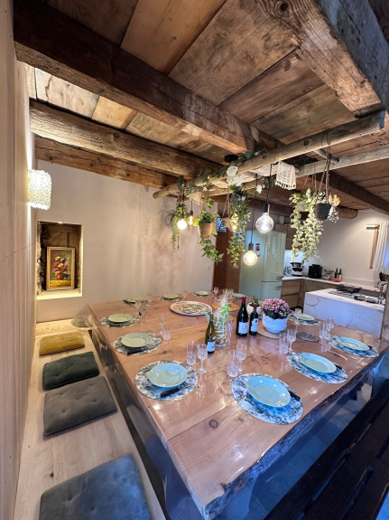 Amplia cocina abierta al salón, mesa de comedor 2,50x2,50 con plato giratorio para comidas de convivencia en familia o con amigos, una sala estilo pub irlandés para disfrutar de un bar privado como si estuvieras allí: 3 TV, home cinema con sonido 360°, chimenea, sofá Chesterfield, futbolín, dardos.