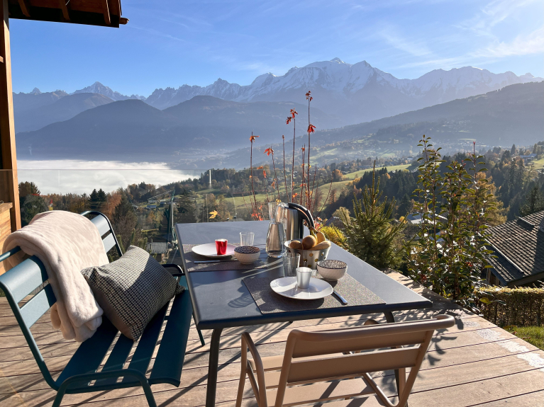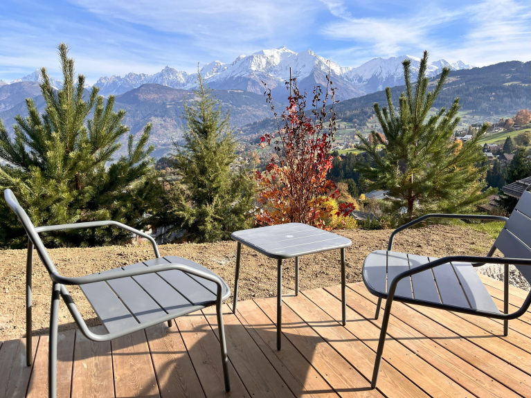 Jardín y dos terrazas frente al Mont Blanc con mesas de exterior, barbacoa eléctrica y tumbonas.