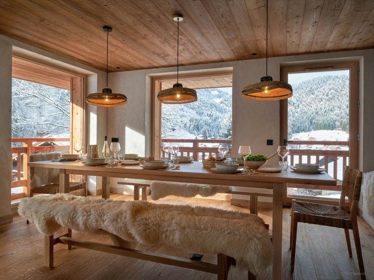 El salón de la primera planta está bañado de luz natural gracias a sus grandes ventanales y se abre a una terraza panorámica. Combina una cocina moderna y funcional, una mesa de comedor y un salón con estufa de leña. La decoración en madera y los colores neutros de todo el chalet lo hacen especialmente relajante.