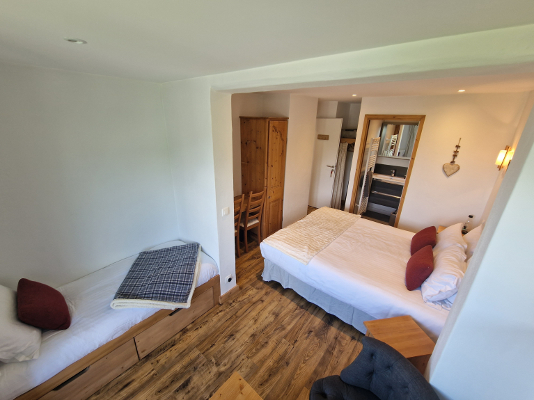 El Chalet du Vernay está idealmente situado en una calle tranquila y residencial, para disfrutar del sol desde el mediodía hasta la noche, con una vista excepcional de las cordilleras de Aravis y Fiz desde la terraza, el jacuzzi y todas las habitaciones del chalet.