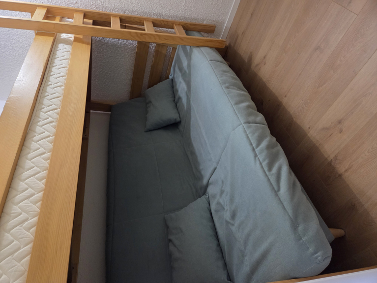 - 1 dormitorio con sofá cama (140*190 cm), cama en altillo y espacio de almacenamiento.