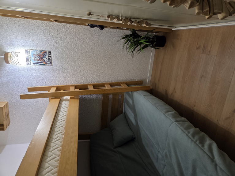 - 1 dormitorio con sofá cama (140*190 cm), cama en altillo y espacio de almacenamiento.