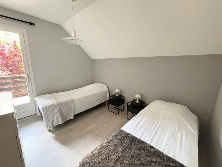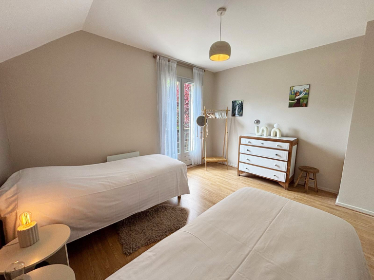 Distribuida en dos niveles, la casa cuenta con cuatro cómodos dormitorios: tres tienen dos camas individuales cada uno, lo que permite diferentes configuraciones (las camas pueden estar o no juntas), mientras que el cuarto tiene una cama doble y una cama individual, ideal para una pareja con un niño.