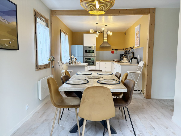 El salón se abre a una cocina totalmente equipada: placa de inducción, horno, frigorífico-congelador, lavavajillas, tostadora, hervidor de agua, máquina de raclette... todo lo necesario para compartir una buena comida después de un día en la montaña.