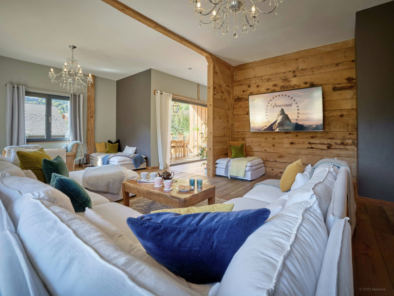 La espaciosa sala de estar se caracteriza por los colores suaves y los materiales naturales. El salón es cálido y acogedor, con sofás, sillones, televisor y estufa de leña. Enfrente está la moderna cocina, con una encimera central, tres hornos y una placa de inducción, así como una gran mesa de comedor. El espacio se complementa con una bodega y dos mesas de teletrabajo.