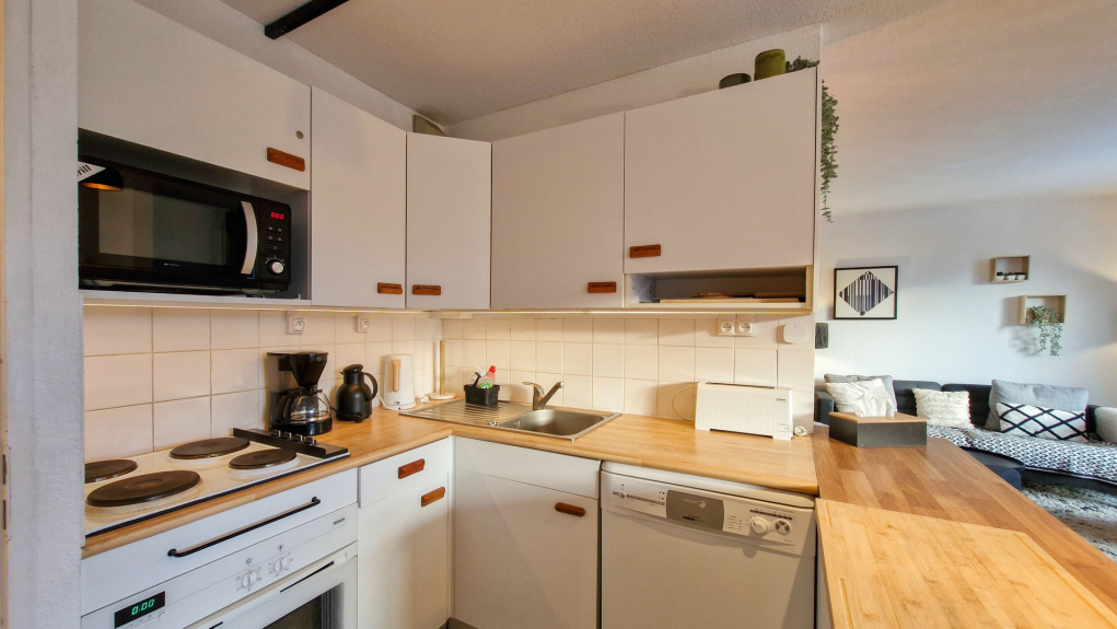 - Zona de cocina con placa eléctrica, horno, microondas, lavavajillas y frigorífico