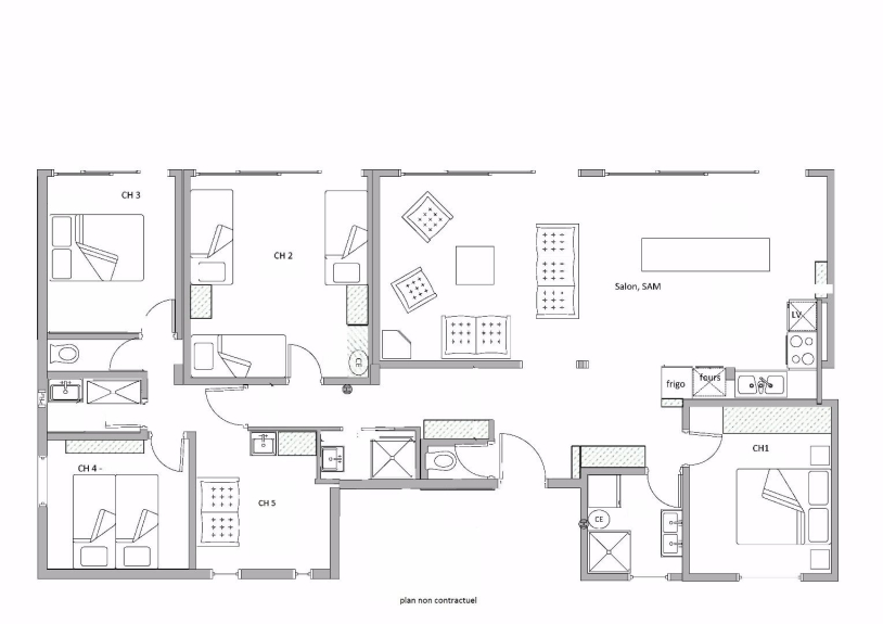 La distribución del piso es de un dormitorio con baño y aseo separado en un extremo y tres dormitorios en el otro extremo con baño y aseo separado. El salón-comedor está en el centro, así como el dormitorio de los niños con 6 camas y baño. Esta configuración es ideal para una estancia multifamiliar.