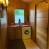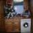 espacio de almacenamiento y lavadora. Equipo de limpieza, aspiradora, plancha y tabla de planchar.