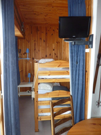 Cocina independiente y equipada. Alcoba separada por una cortina con ventana y que incluye literas.