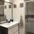 - un bagno con doccia con WC sospeso, unità lavabo, doccia, asciugacapelli