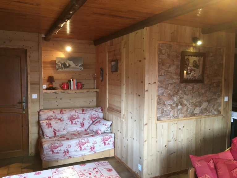 ATMOSFERA DA CHALET DI LEGNO, DECORAZIONE RECENTE E CALDA.