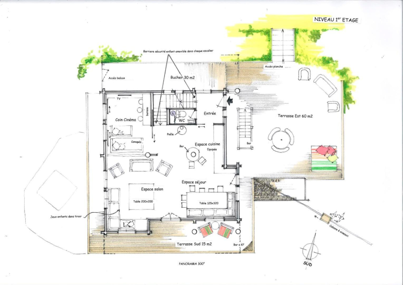 Al 1 ° piano, ampio soggiorno di 110 m2 con: cucina pratica e super attrezzata; grande tavolo da pranzo 3m50 x 1m25; soggiorno con 12 comodi posti a sedere; home cinema - schermo al plasma full HD + sound bar con lettore DVD/DVX, Cd, Iphone, Ipod, Usb, Sd card, Easy link (partizione scorrevole per chiudere questo spazio); stufa a legna con legna, log & bar self-service - Internet Wifi.