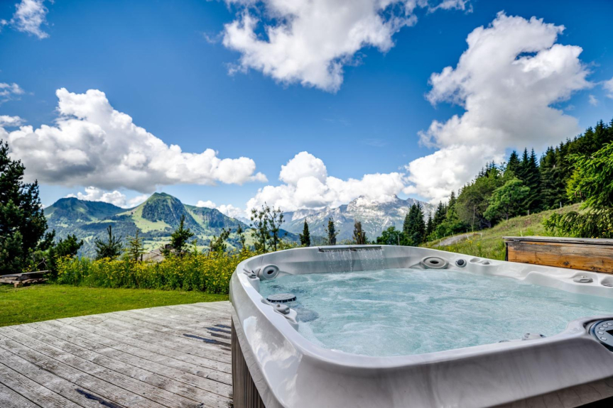 Jacuzzi esterna 6 posti, per ammirare il tramonto o per una spa sotto le stelle! Cascata Water Rainbow, cromoterapia, cupola centrale per il massaggio dei piedi e 48 getti per un idromassaggio confortevole e di qualità. Filtrazione Pro, Ph7. Temperatura 39°.