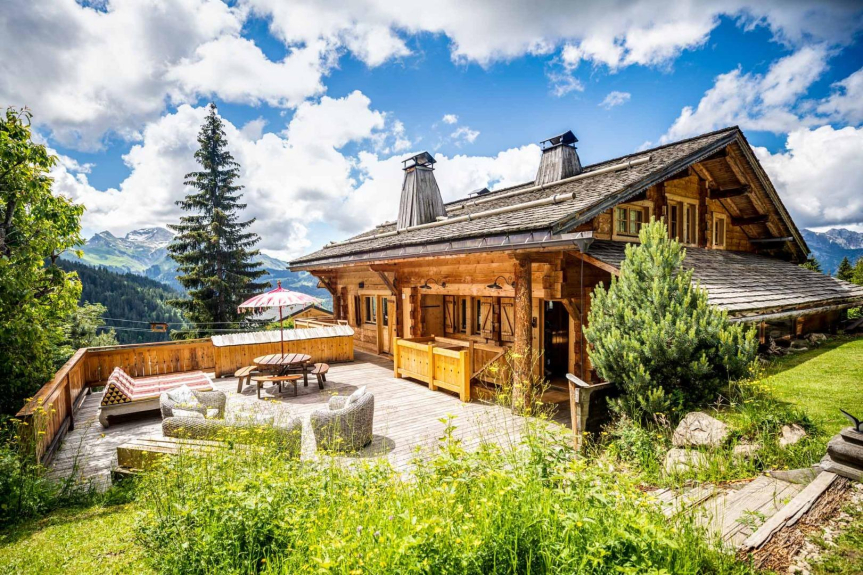 All'esterno sullo stesso livello: log-bar di 30m2; terrazza di legno di 60m2 con tavolo rotondo per 8 persone; grandi balconi intorno allo chalet con amache e sedie a sdraio + terrazza di 200m2.