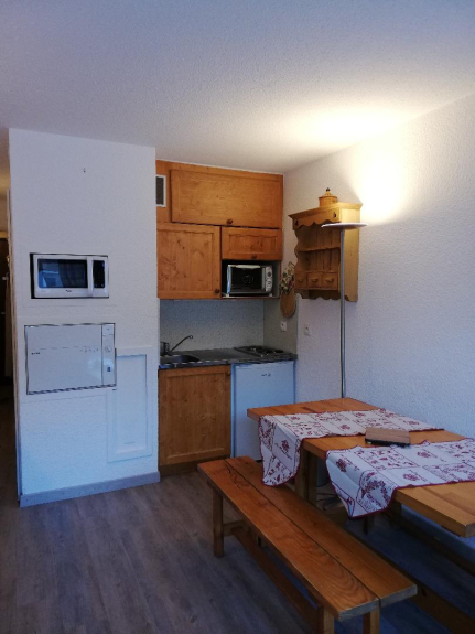 Affittasi cabina monolocale 25 m² - 4 persone in una residenza tranquilla ai piedi delle piste, balcone con vista sulle montagne, esposizione sud, negozi, ristorante, catering, pane e noleggio sci in fondo all'edificio. Ingresso, zona cabina con letto a castello (2 letti singoli), bagno con WC, soggiorno con angolo cottura attrezzato, piano cottura elettrico, frigorifero nu, lavastoviglie, forno, microonde, macchina per raclette e pancake, macchina per fonduta, tostapane, sbattitore elettrico, caffettiera elettrica, pentola a pressione, ferro da stiro, TV a schermo piatto, aspirapolvere, letto matrimoniale / divano letto. La cucina è stata rinnovata in legno e il televisore sostituito da uno schermo piatto.
