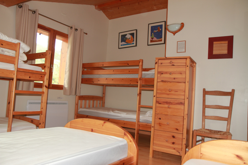 . Camera da letto 4/dormitorio: con 2 letti singoli in legno 90 cm e 2 letti a castello 90 cm (6 posti letto) (rete a doghe, materasso in schiuma ad alta densità), 2 comodini con lampade, cassettiera. 1 sedia di paglia. Riscaldatore elettrico radiante.