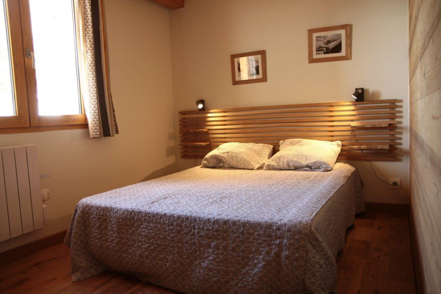 . Camera da letto 2: dotata di un armadio, letto matrimoniale 140 cm (rete a doghe e materasso in schiuma ad alta densità), 2 comodini con faretti, 1 poltrona in legno, radiatore a olio elettrico.