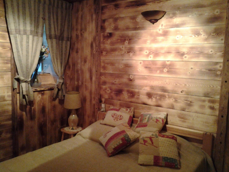 ATMOSFERA DA CHALET DI LEGNO, DECORAZIONE RECENTE E CALDA.
