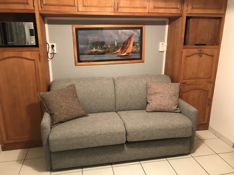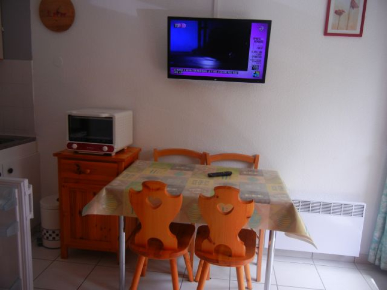 Studio attrezzato: nuova biancheria da letto di montagna (2 x 80), letto BZ (1,60m), forno, microonde, frigorifero, raclette, fonduta, macchina da caffè, tostapane, pierrade, aspirapolvere, TV grande schermo (80cm), lettore Dvd, Divx, ect....