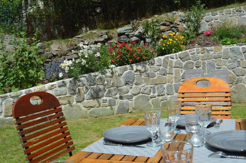 Accesso al giardino privato fiorito dal soggiorno. Terrazza in legno, tavolo e sedie da giardino, sedie a sdraio.