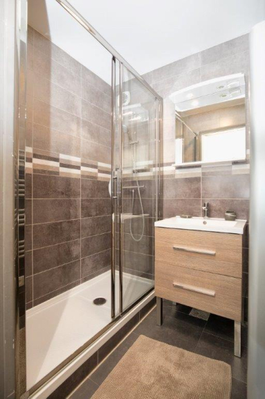 Bagno con grande doccia e asciuga asciugamani elettrico.
