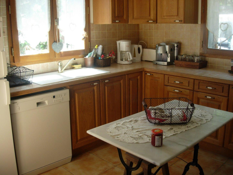 Ingresso con guardaroba, WC + lavatrice, camera parentale con bagno, soggiorno / salotto con grande camino (legno fornito), cucina indipendente (frigorifero con congelatore, lavastoviglie, macchina per il caffè, macchina per caffè espresso, bollitore, forno, 4 piastre elettriche, apparecchi per fonduta e raclette, macchina per waffle, thermomix Vorwerk, tostapane, microonde) garage e terrazza con tavoli, sedie da giardino, sdraio e parassol.