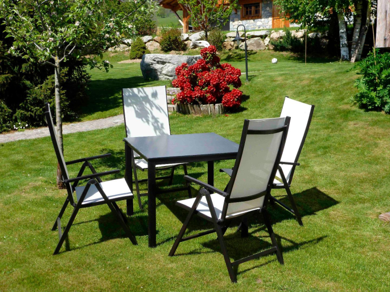 Giardino con alberi e salotto all'aperto in estate