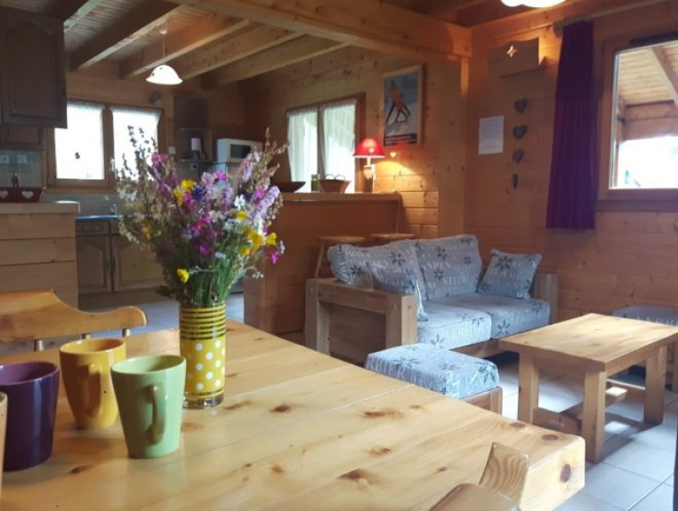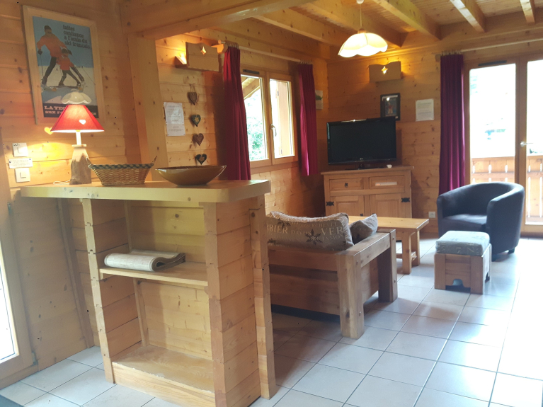 Il soggiorno è dotato di divani e di una piccola stufa a legna con fuoco aperto, che conferisce un'atmosfera accogliente da chalet.
