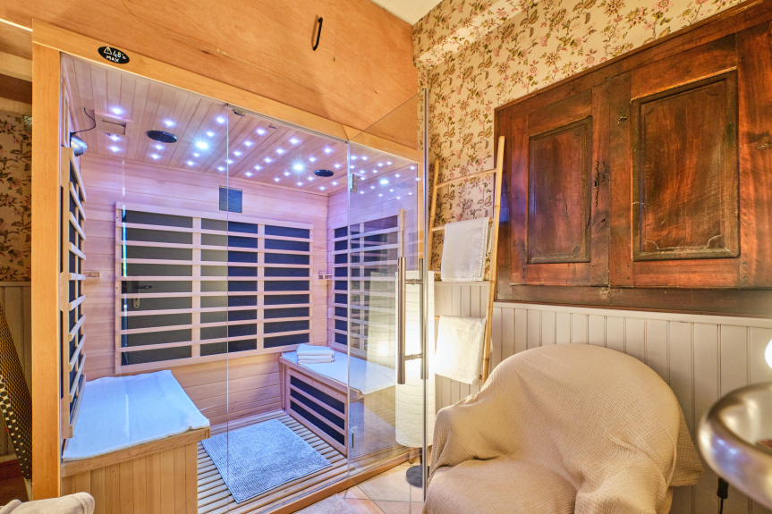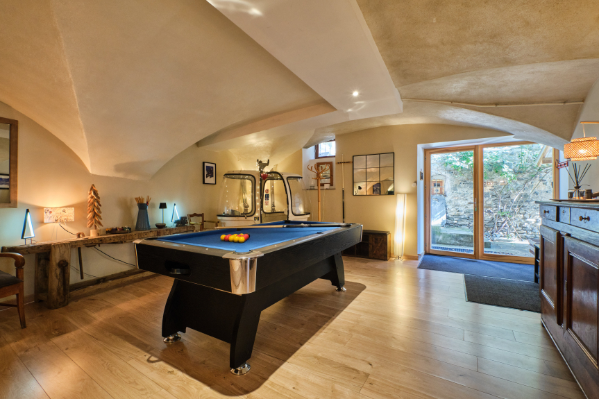 Godetevi i soffitti a volta del grande soggiorno, un calcio balilla, la cucina/area lounge e la stufa a legna, un'area per bambini (console giochi/TV), sauna e tavolo da massaggio.