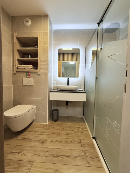 Situato nella residenza 5* "Les Terrasses d'Eos", bellissimo appartamento composto da: ingresso con armadio, cucina aperta su soggiorno con terrazza, due camere con due bagni. Armadio per gli sci e parcheggio coperto.
