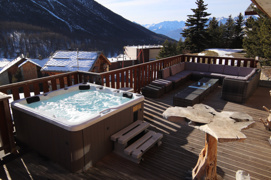 Lo chalet si sviluppa su 3 piani. Al piano terra si trovano la sala cinema, 3 camere matrimoniali, la sauna radiante e 1 bagno con doccia e WC separato. Si ha accesso alla grande terrazza dove si può godere del sole tutto l'anno. Il solarium permette di godere della bellezza delle montagne circostanti, sia che siate sdraiati su un lettino per l'indispensabile abbronzatura da "settimana bianca", sia che siate a tavola a bere un caffè, sia che siate in costume da bagno nella vasca idromassaggio riscaldata a 37°.