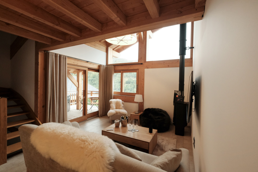 Soggiorno con televisione e bruciatore a legna che si apre su un balcone di 14m² dotato di vasca idromassaggio, tavolo e sedie.