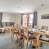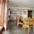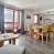 Cucina aperta attrezzata con 4 piastre a induzione, frigorifero, forno, microonde, lavastoviglie.