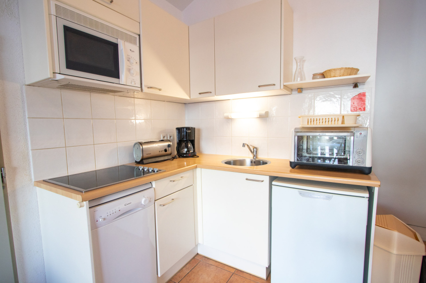 Cucina: piano cottura in vetroceramica, forno, microonde, frigorifero, lavastoviglie, lavatrice e tutte le stoviglie e posate.