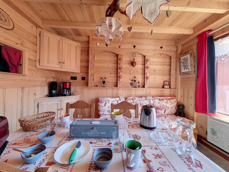 Cucina attrezzata: frigorifero, 2 piastre elettriche, lavastoviglie, forno tradizionale e microonde, raclette, macchina da caffè elettrica + bollitore + macchina per cialde.