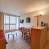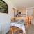 Cucina in muratura con 2 piastre elettriche, forno a microonde, frigorifero, lavastoviglie, tostapane, macchina da caffè, bollitore e macchina da caffè Senseo.
