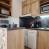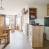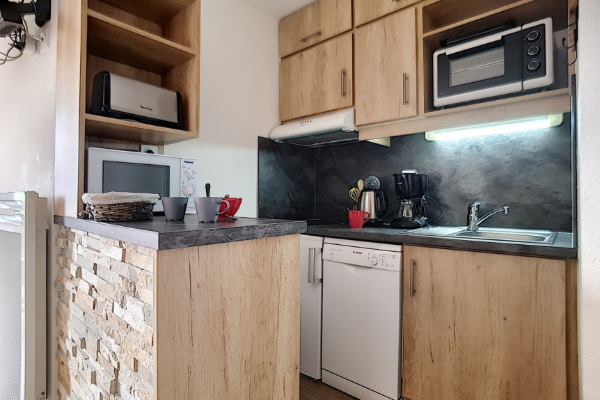 Cucina integrata con 2 piastre in ceramica, forno tradizionale, microonde, frigorifero, cappa, lavastoviglie, tostapane, bollitore e macchina da caffè.