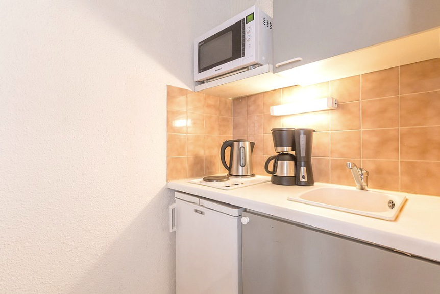 Cucina attrezzata con 2 piastre elettriche, frigorifero, microonde, bollitore, macchina da caffè e tostapane.