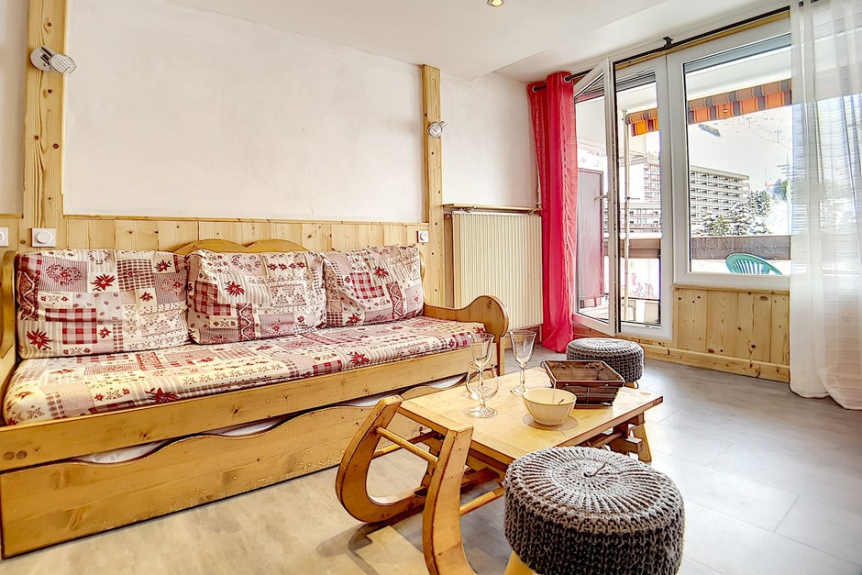 Bellissimo appartamento completamente rinnovato, esposto a sud-est, con balcone. 38 m² per 5 persone. Si trova sopra il centro commerciale, al 1° piano di una residenza con gli sci ai piedi.