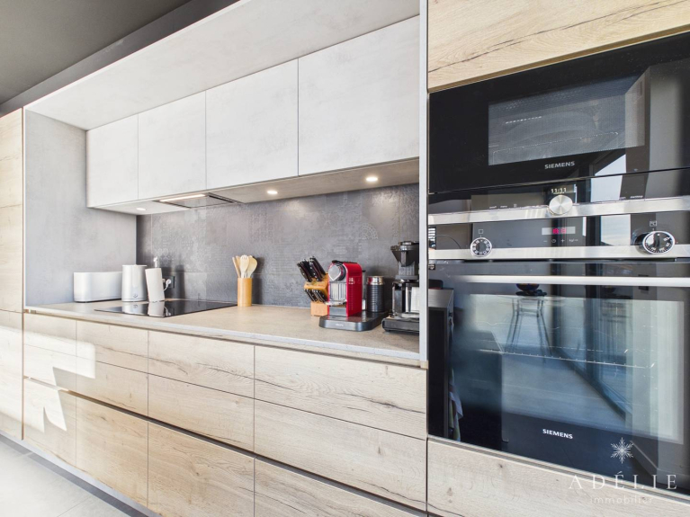 Cucina completamente attrezzata: piano cottura in vetroceramica, frigorifero e freezer, lavastoviglie, forno, microonde.