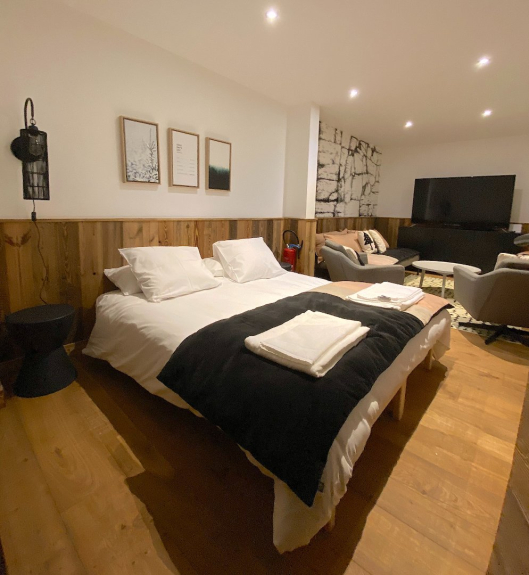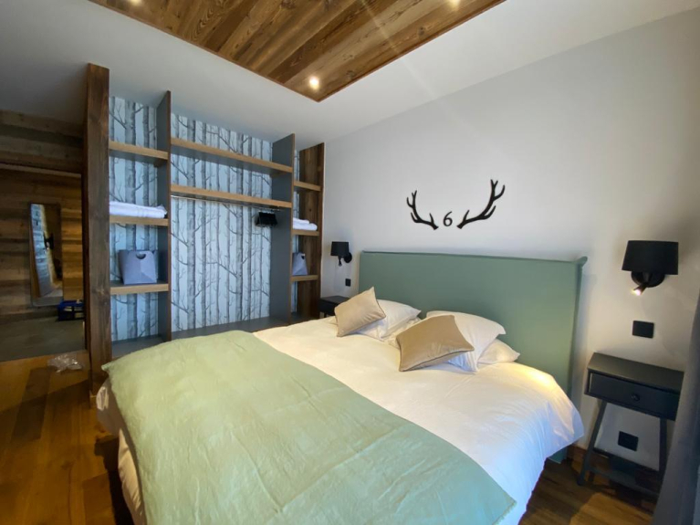 - 1 suite con un letto 180x200 cm sotto il tetto con un divano letto che può ospitare 2 letti supplementari e una zona ufficio e un bagno e doccia con vista sulle piste.