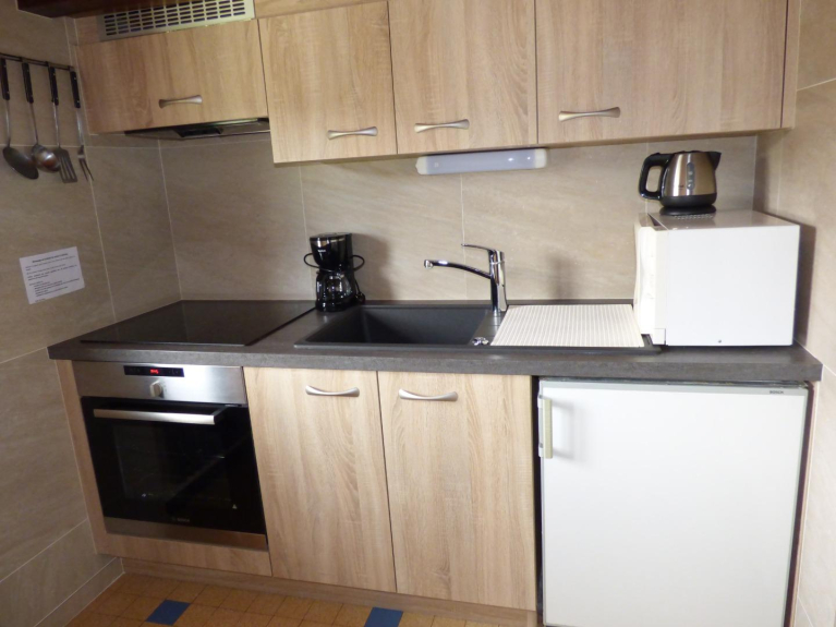 È composto da una cucina indipendente, un soggiorno/camera da letto (1 letto 140x190, 1 divano letto 80, TV) e un bagno con WC.
