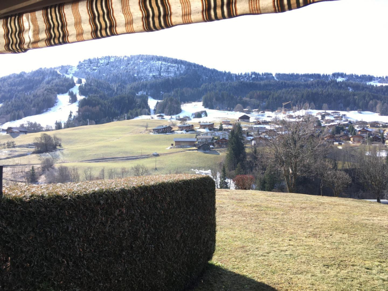 Bella terrazza esposta a sud con vista panoramica sulle montagne e sulle piste, affacciata sul giardino del residence, perfetta per giocare con la neve!