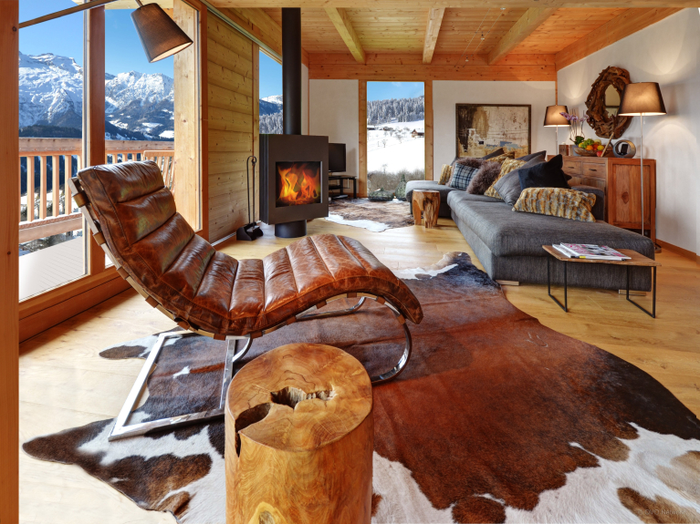 Che piacere essere allo Chalet Chocolat dopo una giornata in montagna! Seduti comodamente sull'enorme divano, infilati nei cuscini, si può guardare il sole che tramonta sulle cime attraverso le grandi finestre.